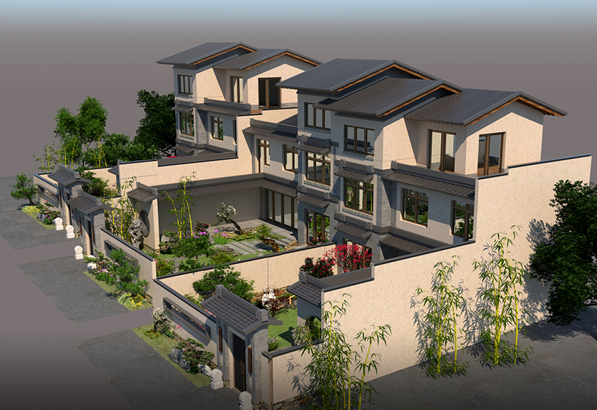 根据路网设计,做地块划分,建立起完整的规划布局;以组团为单位,形成组团式(或称部落式或大合院式)布局,每一个组团充分考虑了地形状况;建立“5+1”规划结构模式,即五方+一配套;